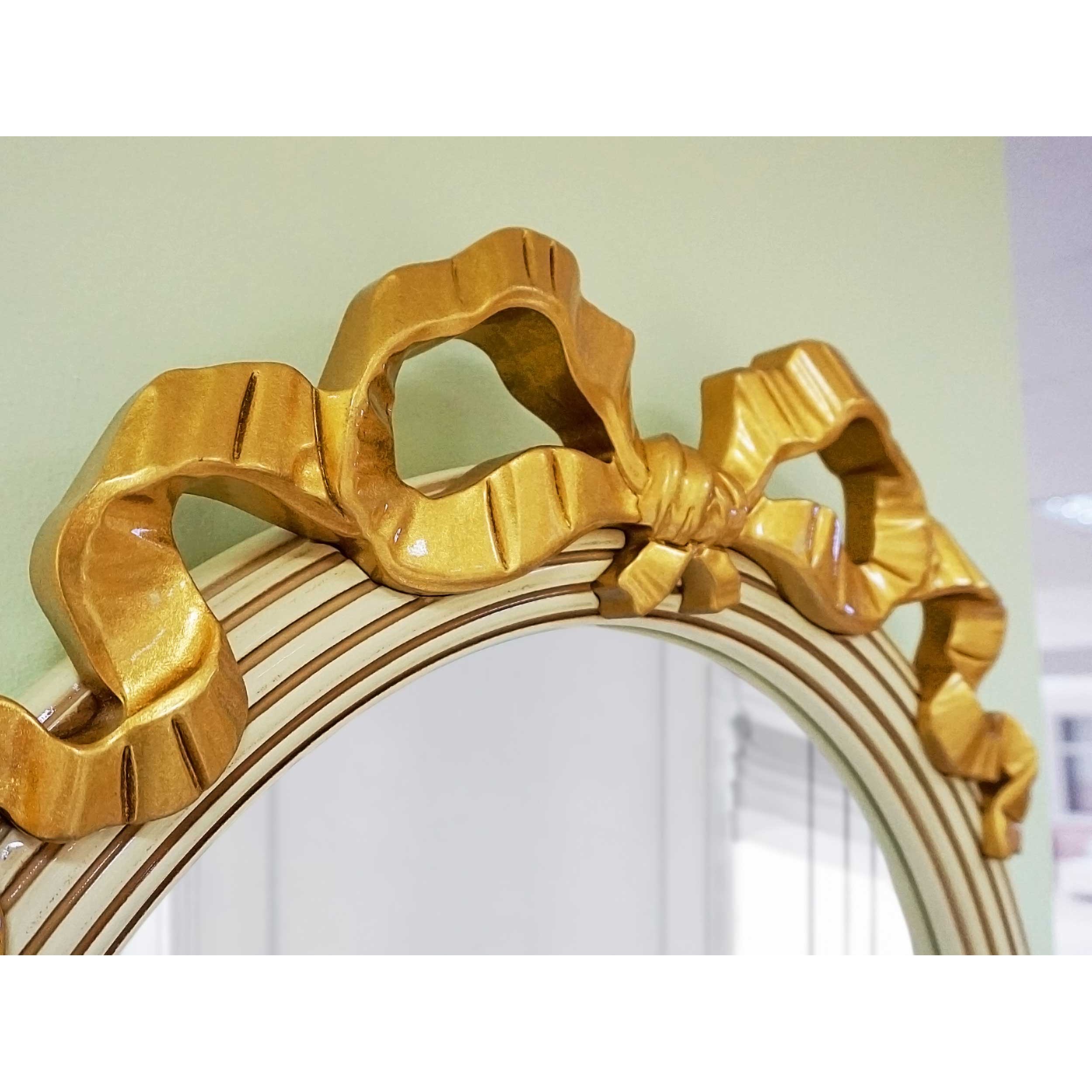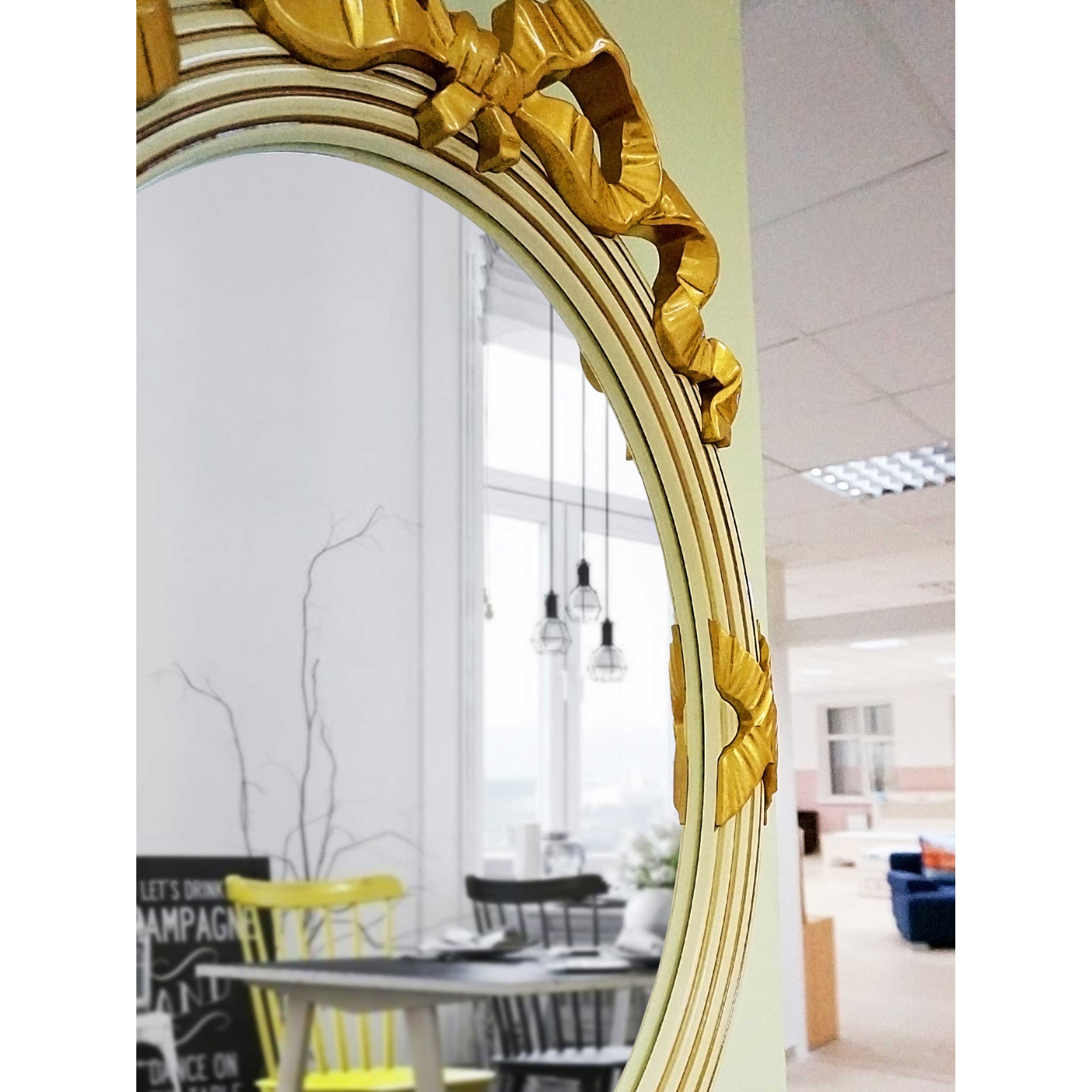 Классическое зеркало овальной формы. Декор в виде вьющихся лент на раме прошел испытание временем и прочно закрепился в дизайне классических зеркал.